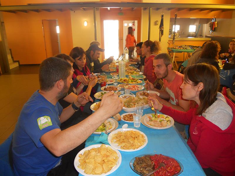 Què millor que un dinar casolà fet per les mares i servit en el local social? A la foto la Mar, en Santi, en Josep , la Susanna i la Cristina gaudeixen del menú vegetarià…