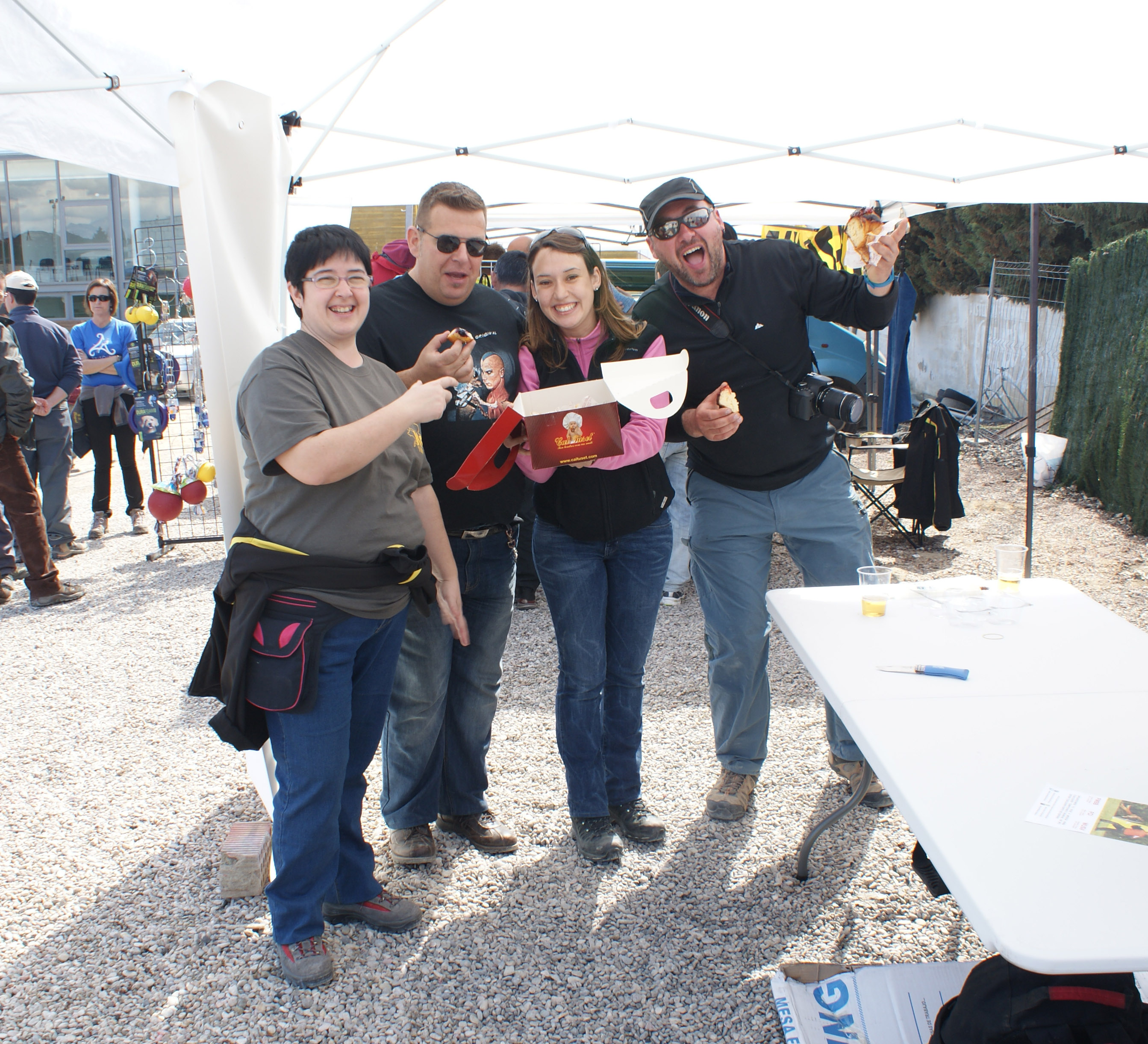 La Mar i l’Antón (responsables de Julius K9 a Espanya), l’Ángel (co-organitzador del workshop de l’Aneta Migas) i una servidora a punt de fer un atac llançat a una capsa de magdalenes Cal Tuset! 🙂