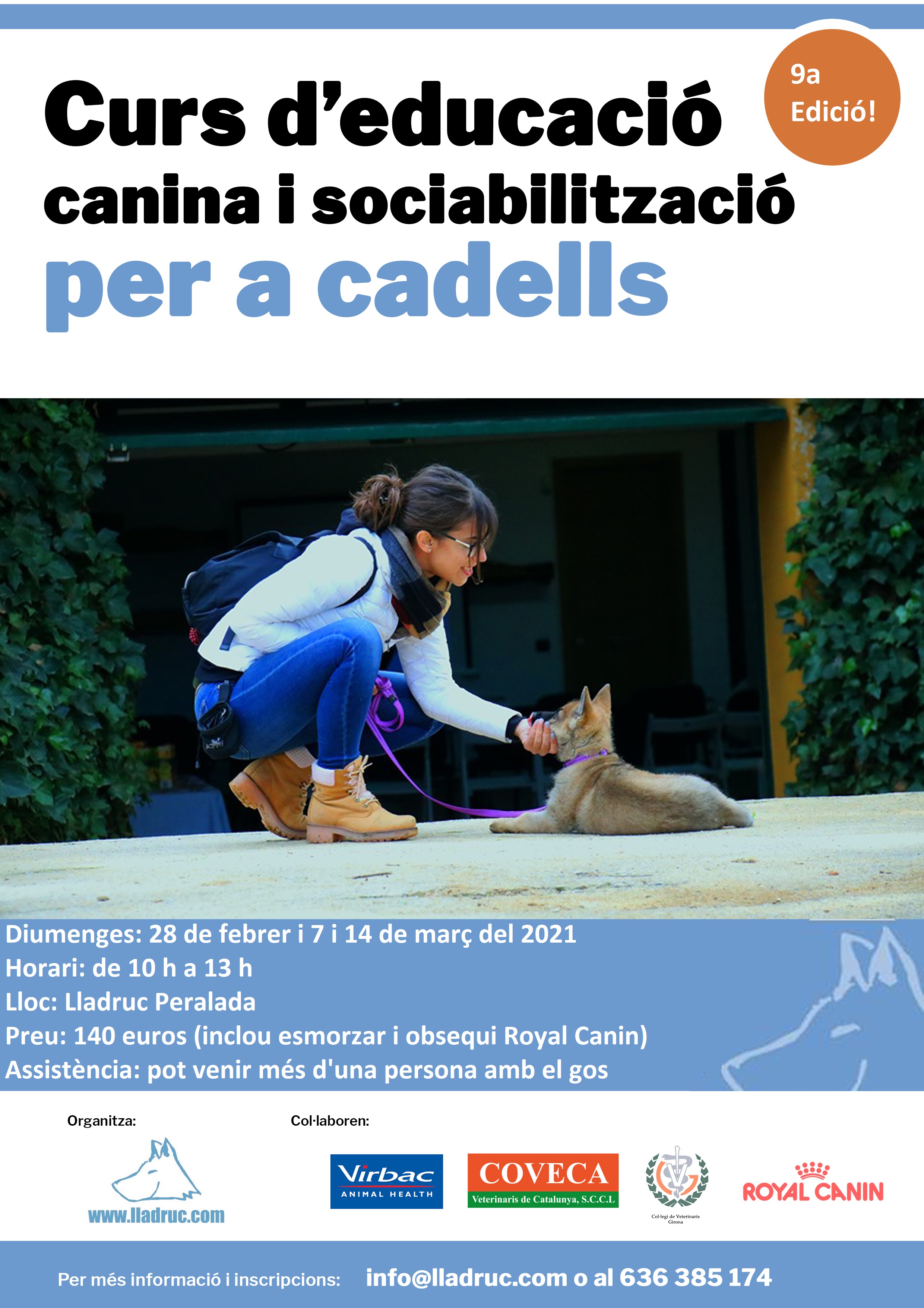 Després de l’èxit de les set edicions anteriors, a Lladruc us tornem a oferir un curs d’educació canina i sociabilització per a cadells. Ja sabeu que el fem a l’aire lliure, en un espai magnífic i únic a l’Empordà, totalment vallat, rodejat de gespa, oliveres i suredes. Tota la família podrà gaudir d’ensinistrar millor el seu gos!