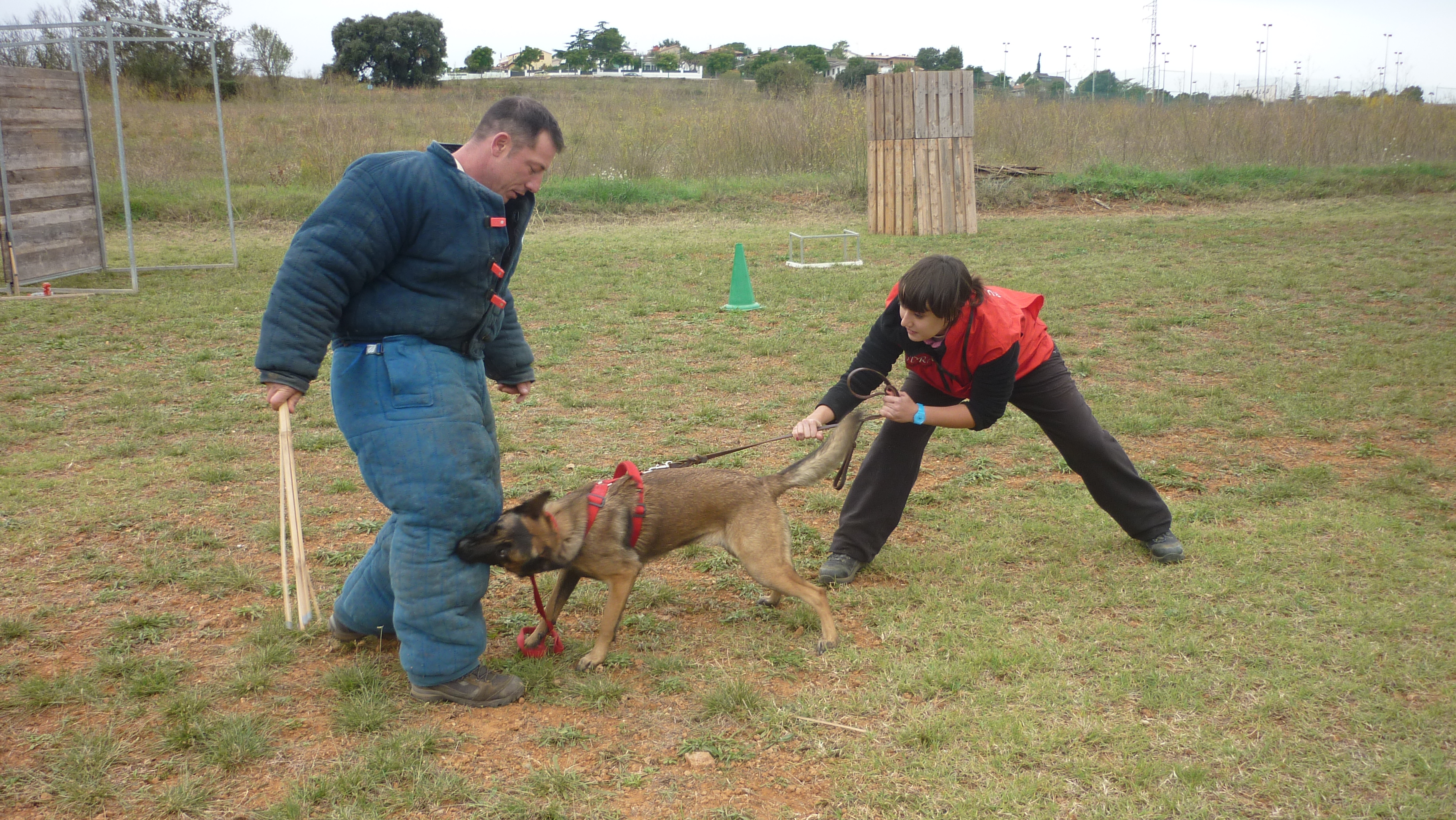 Perdoneu que no hagi publicat res abans però de seguida us aclariré la causa del meu mutisme. Diumenge em vaig estrenar amb ring francès i n’he quedat fascinada. Vaig tenir l’oportunitat de conèixer personalment en Xavier Marsinyach www.delaserralada.com que reuneix allò tan poc comú en el nostre país: un currículum brillant només superat per una humilitat, desig d’ensenyar i generositat increïbles. I precisament aquesta generositat va ser la que més em va sorpendre quan, només baixar del cotxe, em va dir “vine cap aquí”, em va ensenyar un lavabo i en vaig sortir amb un “traje”. La sensació que vaig tenir, literalment, és la de portar un vestit d’astronauta amb un munt de ploms al damunt, costa taaant moure’s allà dins! Per acostumar-m’hi, però, res millor que un bon escalfament. I allà ens teniu, a mi i al meu abundant teixit adipós, altrament anomenat “mitxelins” (o com s’escrigui) fent esforços per no afogar-nos en córrer per la pista o fer “salts de granota”. El més emocionant, però, va ser quan van treure la Bercy, una preciosa pastor belga malinois, perquè mossegués. La sensació que vaig tenir és difícilment descriptible. Vaig notar una pressió i una força brutal a mitja cama però, contrariàriament al que m’havia imaginat, no vaig tenir, ni per un moment, sensació de perill o por. Simplement vaig disfrutar. Vaig gaudir de tota la potència de les seves dents clavades, de notar com em pujava l’adrenalina, de la sensació d’ingravidesa (de fet em van haver d’aguantar per no caure!) de… impossible descriure-ho!