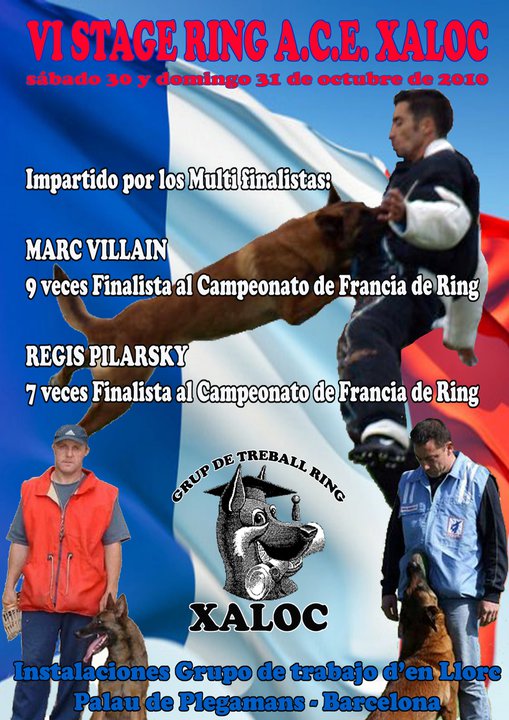 El cap de setmana del 25 al 27 de Setembre vaig anar a un seminari de tècniques de Ring Francès impartit pel reconegut Home d’Atac Jean Marc Alan. La iniciativa i l’organització van ser excel·lents, tant, que fins i tot els organitzadors ens esperaven de bon matí a la porta de l’hotel perquè arribéssim puntualment i sense problemes a la pista. Els assistents van mostrar el millor de si mateixos i dels seus gossos i va regnar, en tot moment, un molt bon ambient i un gran companyerisme. Un exemple d’això va ser l’actuació de la unitat canina de protecció civil de Múrcia que, quan divendres a la tarda em vaig desmaiar, va fer tots els possibles per mantenir-me en el millor estat de salut fins que, per insistència d’en Xavi (Marsinyach), em van dur a l’hospital. Per sort tot es va quedar en un ensurt derivat del problema que tinc a les cervicals des que em van atropellar a l’Abril.